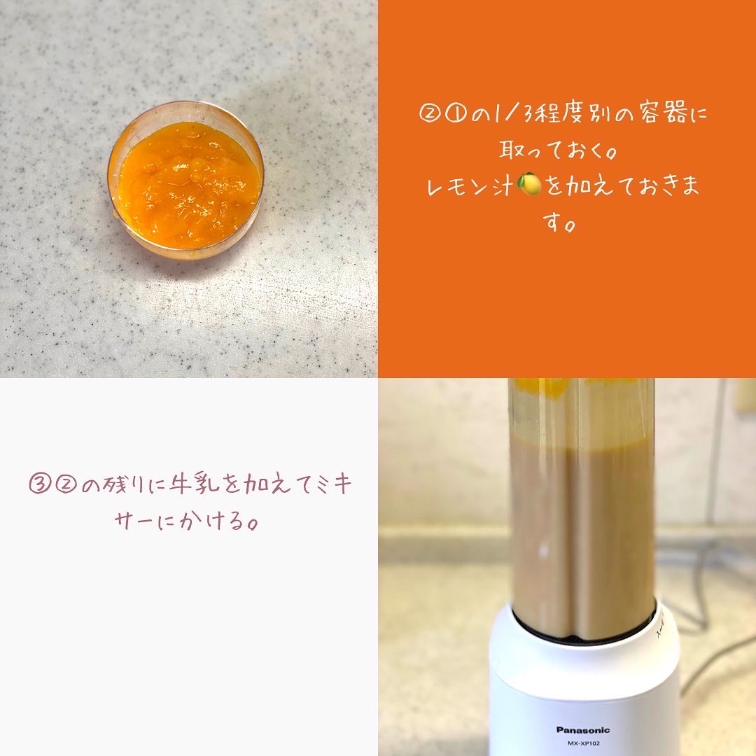 1.柿は2個を皮を剥き、適量な大きさにカットし、ミキサーにかける。アカシアはちみつを小1程度加えておく。